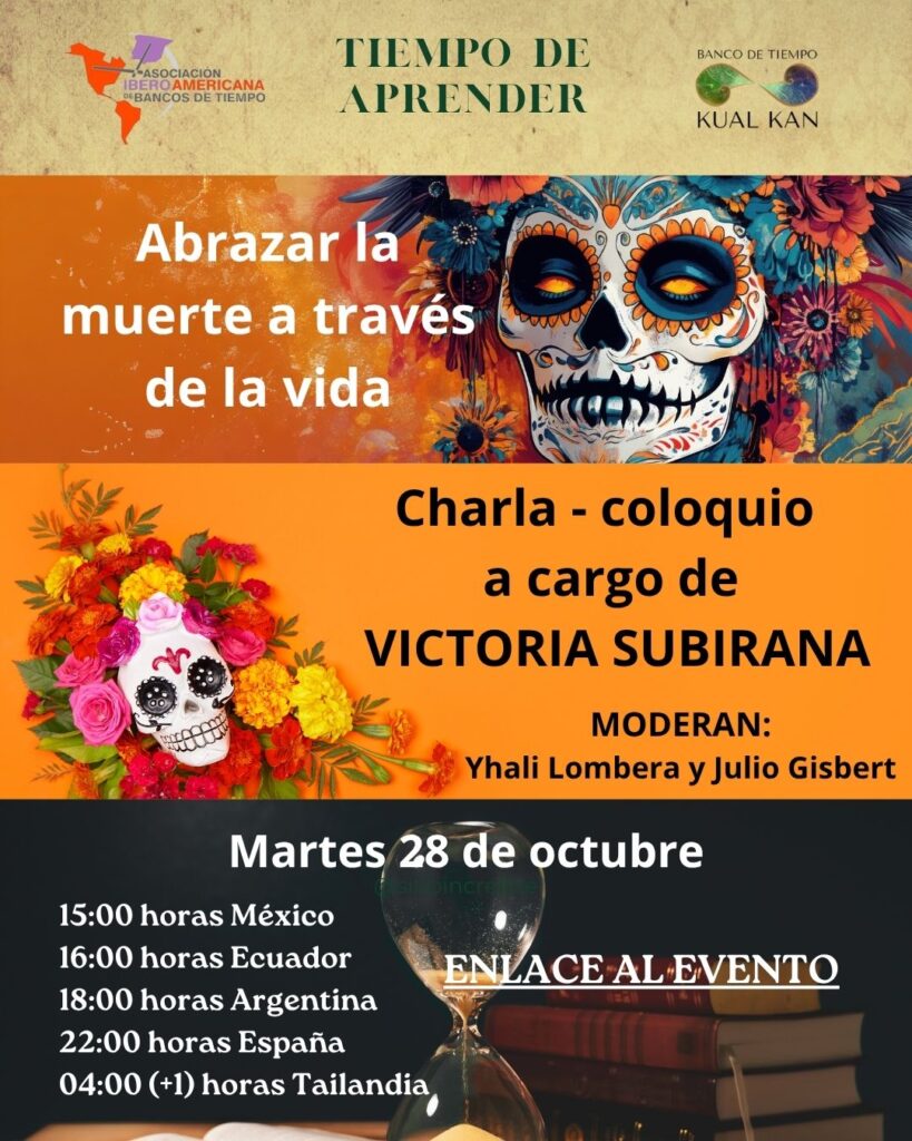 El próximo martes 28 de octubre – en esta ocasión con horario especial a las 15 horas en México, 16 horas en Ecuador y Colombia, 18 horas en Argentina y 22 horas en España – tendremos nuestra undécima conferencia virtual del ciclo TIEMPO DE APRENDER para Usuari@s y amig@s de los Bancos de tiempo en Iberoamérica, con el título de “ABRAZAR LA MUERTE A TRAVÉS DE LA VIDA».