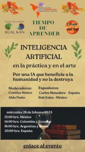 El próximo miércoles 26 de febrero, a las 13 horas en México, 14 horas en Colombia y Ecuador, 16 horas en Argentina y Brasil y 20 horas en España, tendremos nuestra tercera conferencia virtual del ciclo TIEMPO DE APRENDER para Usuari@s y amig@s de los Bancos de tiempo en Iberoamérica con el título de “INTELIGENCIA ARTIFICIAL EN LA PRÁCTICA Y EN EL ARTE”