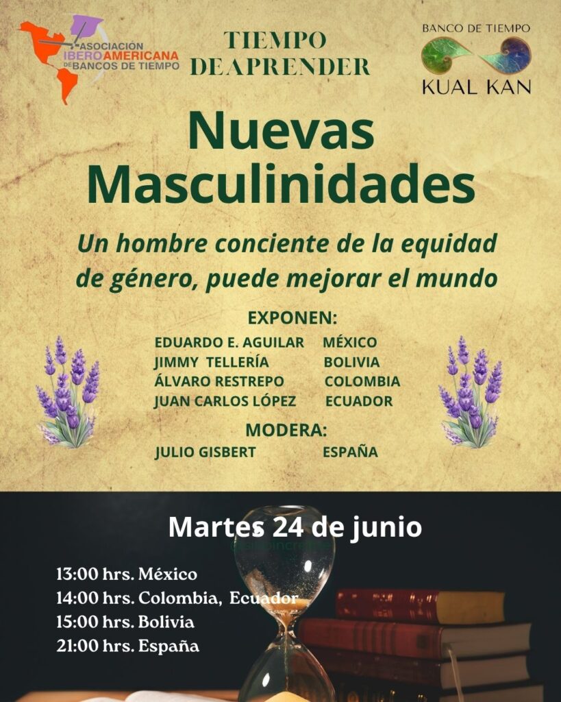 El próximo martes 24 de junio, a las 13 horas en México, 14 horas en Ecuador y Colombia, 15 horas en Bolivia 21 horas en España, tendremos nuestra séptima conferencia virtual del ciclo TIEMPO DE APRENDER para Usuari@s y amig@s de los Bancos de tiempo en Iberoamérica con el título de “NUEVAS MASCULINIDADES: Un hombre consciente de la equidad de género, puede mejorar el mundo”.