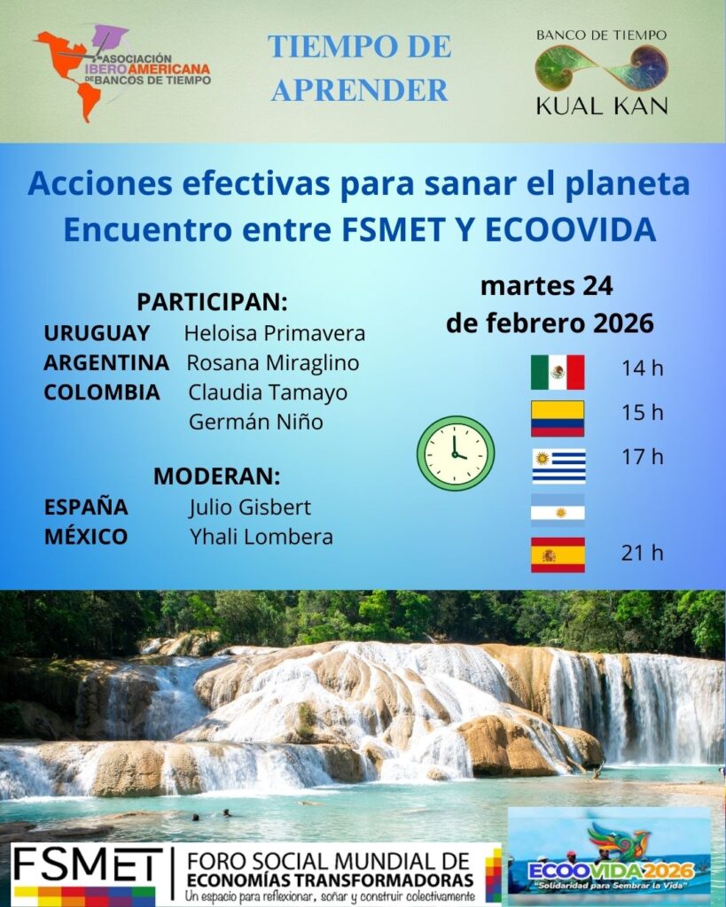 El próximo martes 24 de febrero tendremos nuestra segunda tertulia virtual de este año 2026, dentro del ciclo TIEMPO DE APRENDER para Usuari@s y amig@s de los Bancos de tiempo en Iberoamérica con el título de “Acciones efectivas para sanar el planeta: encuentro entre FSMET Y ECOOVIDA”, con motivo de la celebración de este evento en la ciudad de Cartagena (Colombia) los próximos días 21 al 23 de febrero.