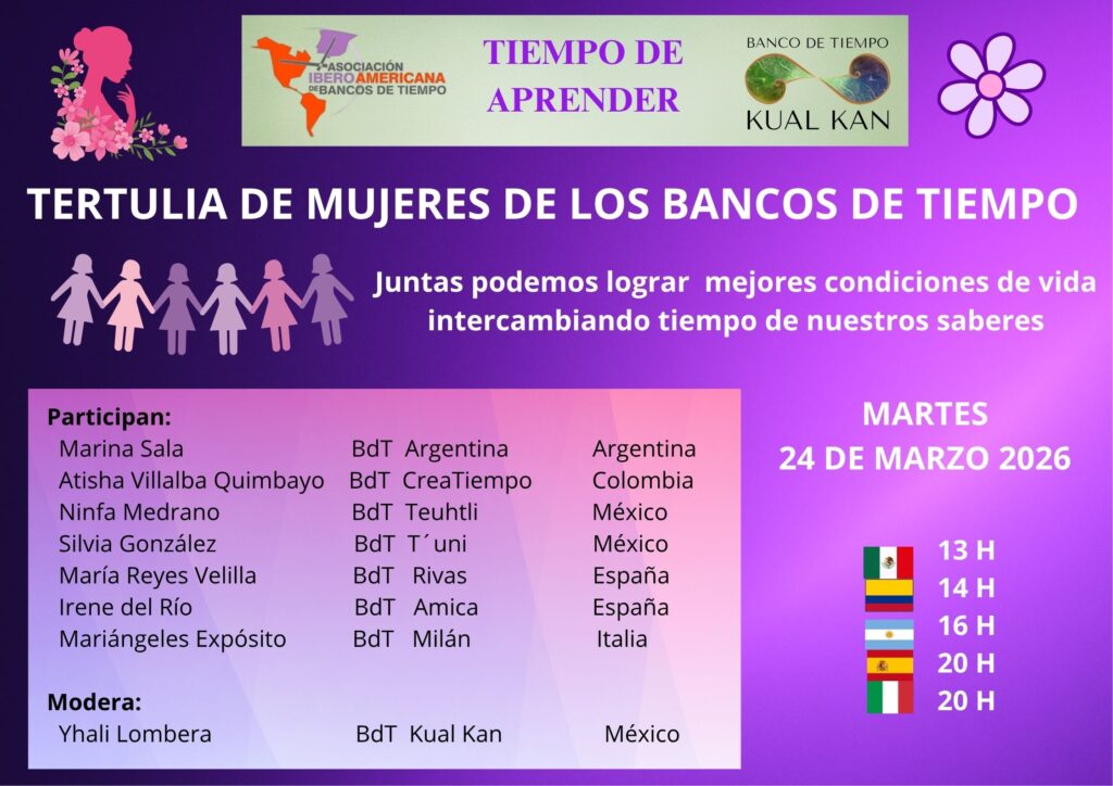 El próximo martes 24 de marzo tendremos nuestra tercera tertulia virtual de este año 2026, dentro del ciclo TIEMPO DE APRENDER para Usuari@s y amig@s de los Bancos de tiempo en Iberoamérica con el título de “TERTULIA DE MUJERES DE LOS BANCOS DE TIEMPO”, con motivo de la celebración del día internacional de la Mujer el pasado 8 de marzo.