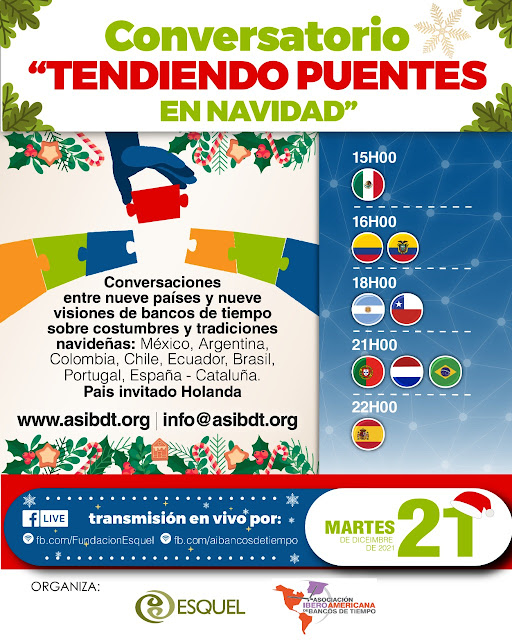 Seguimos con nuestra actividad de tender puentes entre bancos de tiempo de todo el mundo, en este caso y con motivo de la Navidad nos vamos a ver bancos de tiempo de diferentes países – con la invitación especial de los bancos de tiempo de Holanda – el próximo martes día 21, compartiendo entre tod@s cómo vivimos la Navidad en nuestros diferentes países y cómo lo celebramos con nuestras usuarias y usuarios de nuestros bancos de tiempo. Si quieres participar como banco de tiempo en representación de tu país o localidad puedes rellenar ESTE FORMULARIO.