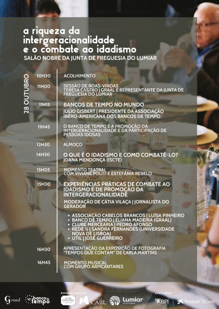 Organizado por la Red portuguesa de Bancos de Tiempo entre otras organizaciones, nuestro presidente, Julio Gisbert , participará en una conferencia sobre Bancos de Tiempo en el mundo, y nuestra vicepresidenta, Eliana Madeira, participará en una interesante mesa redonda sobre experiencias prácticas en la lucha contra el edadismo y la promoción de la intergeneracionalidad. El evento también incluirá una obra de teatro, una actuación musical y la inauguración de la exposición fotográfica de Carla Martins.
