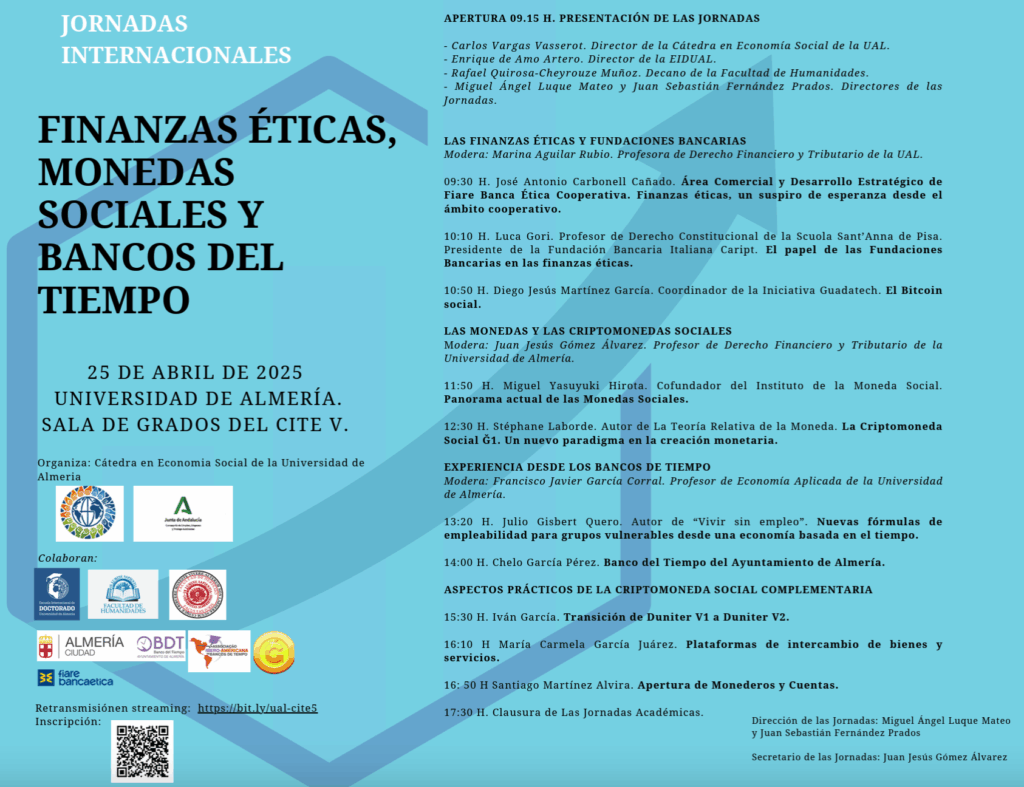 El próximo viernes 25 de abril, nuestra asociación, de la mano del Banco de Tiempo de Almería, participará con dos ponencias en estas jornadas internacionales de las que nuestra asociación ha sido uno de los principales promotores, gracias a la colaboración activa de la Cátedra de Economía Social de la Universidad de Almería, organizadora principal de estas jornadas: