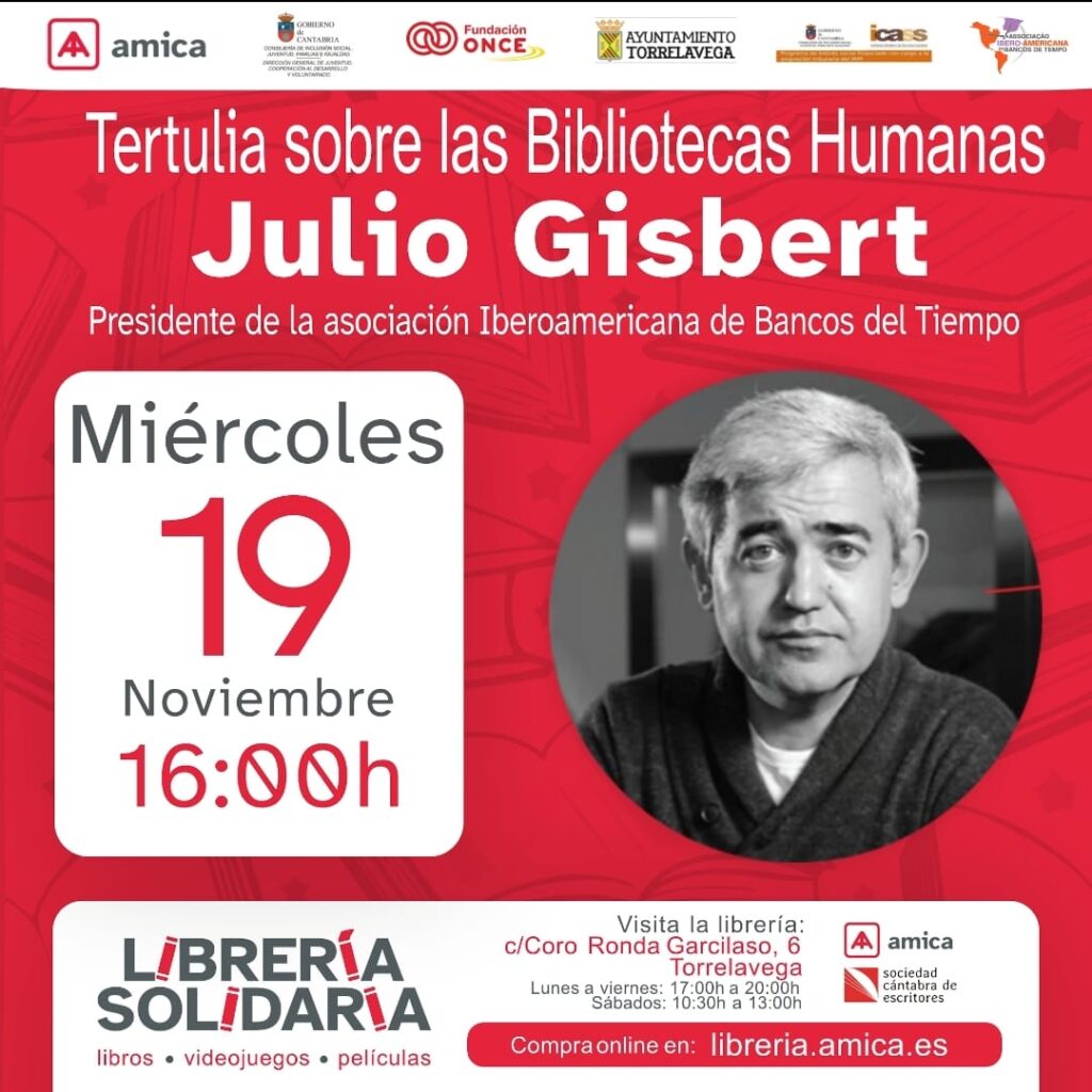 El próximo 19 de noviembre en Torrelavega (Cantabria) daremos una charla sobre BIBLIOTECAS HUMANAS, acto organizado por el Banco de Tiempo AMICA que contará además con la participación de Julio Gisbert, presidente de la ASIBDT. Si queréis conocer más de cerca a este Banco de Tiempo, impulsado por personas con discapacidad y abierto a toda la comunidad, os invitamos a escuchar esta entrevista de radio que les han realizado hace muy pocos dias.